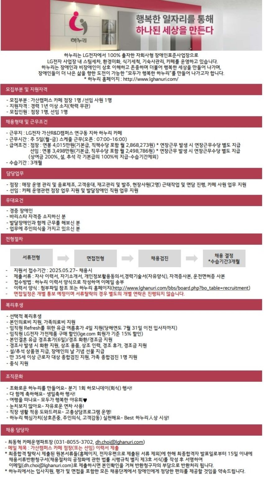 [마감]중부센터 가산캠퍼스 카페 점장 및 바리스타(선임급) 채용(경증장애인 우대)