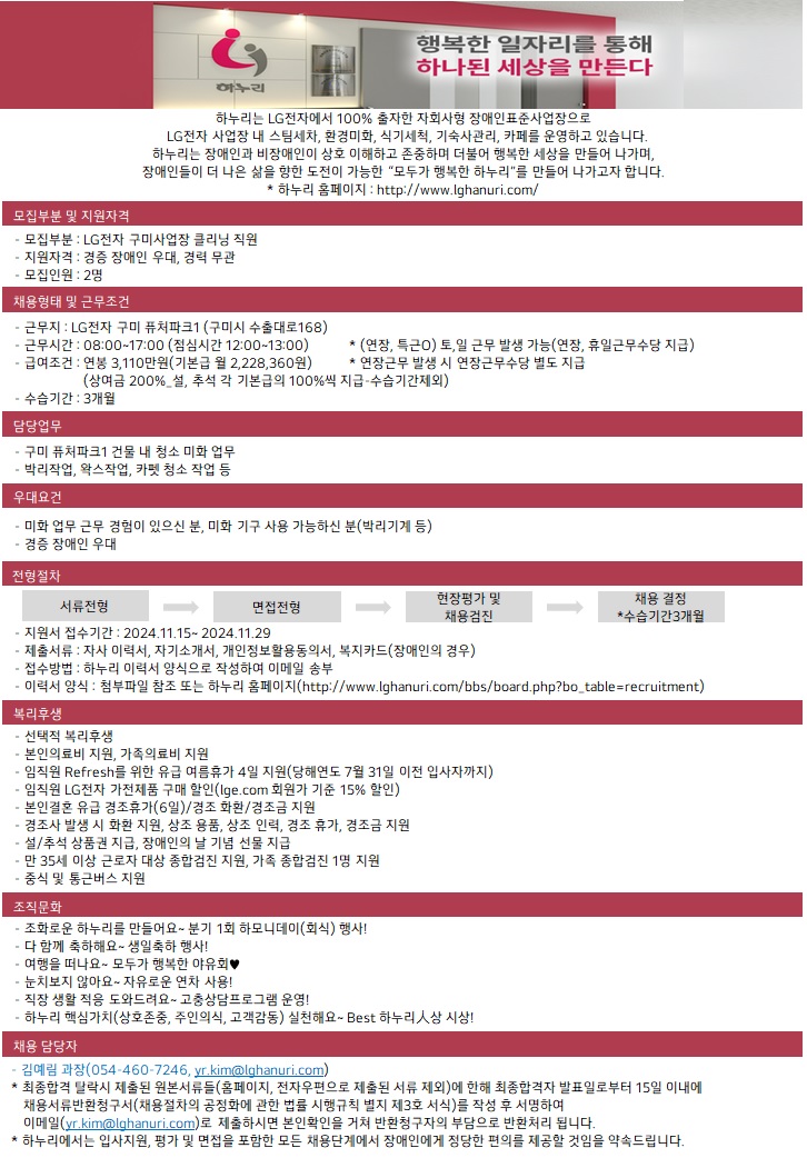 [마감]구미센터 미화 사원 채용(경증장애인 우대)