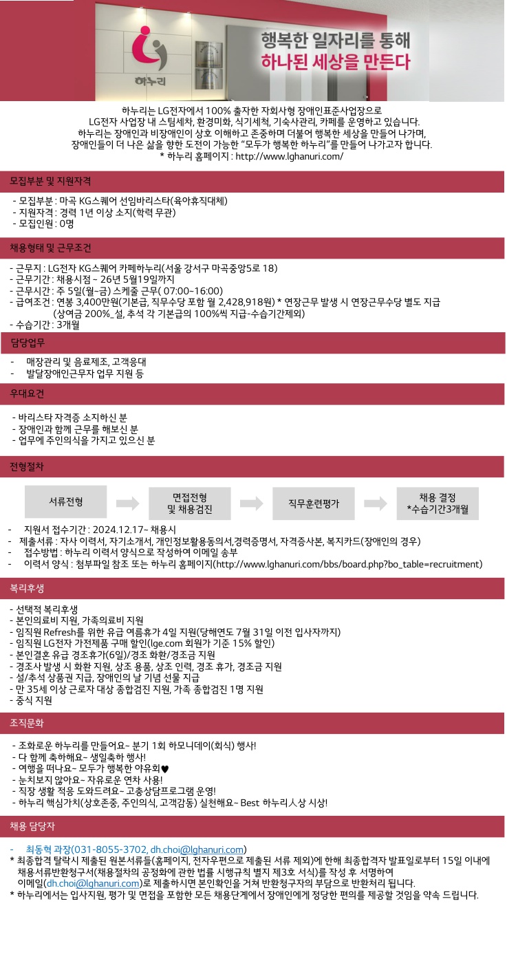 [마감]서울서부센터 마곡지역(KG스퀘어) 카페 바리스타(선임급) 채용