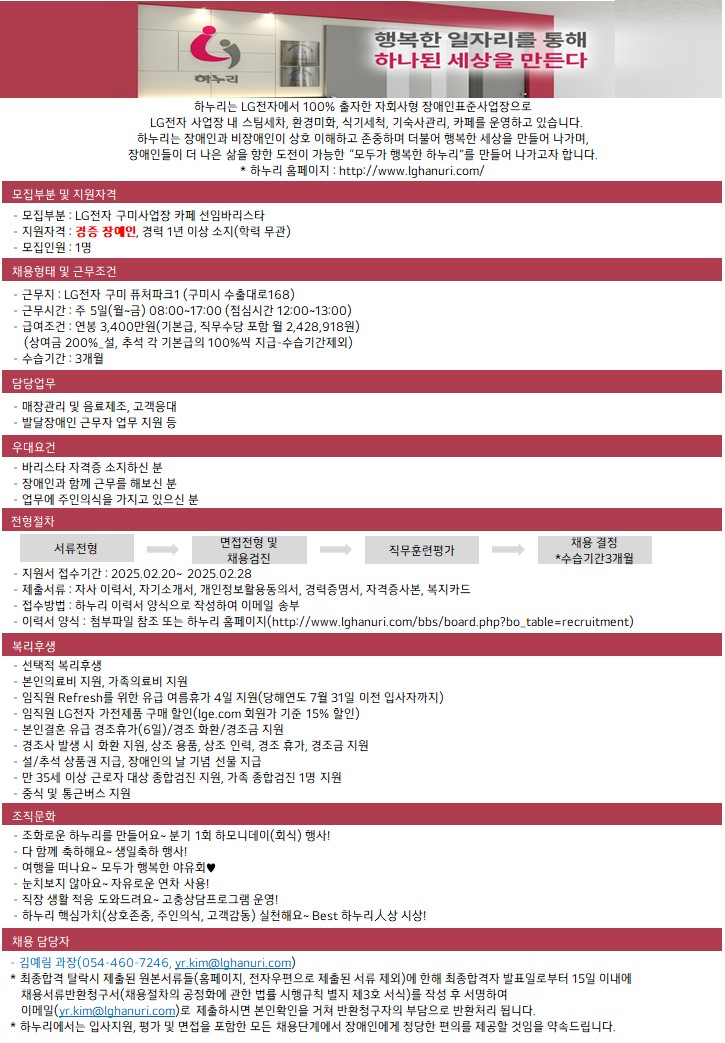 [마감]구미센터 카페 바리스타(선임급) 채용(경증장애인)
