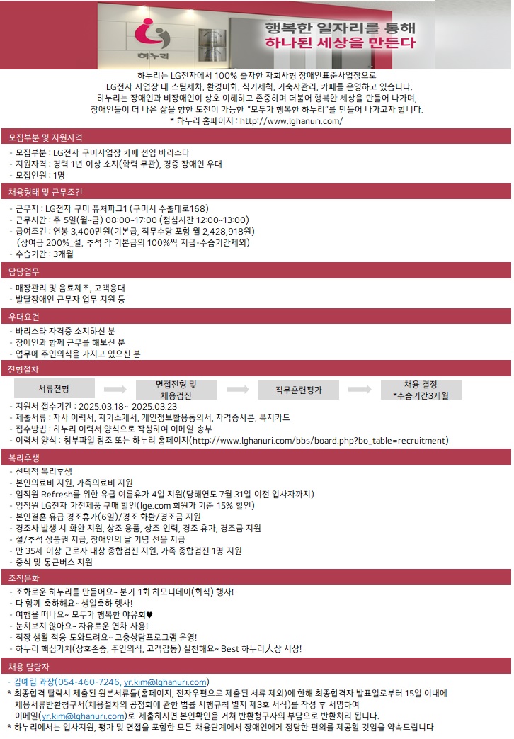 [마감]구미센터 카페 바리스타(선임급) 채용(경증장애인 우대)