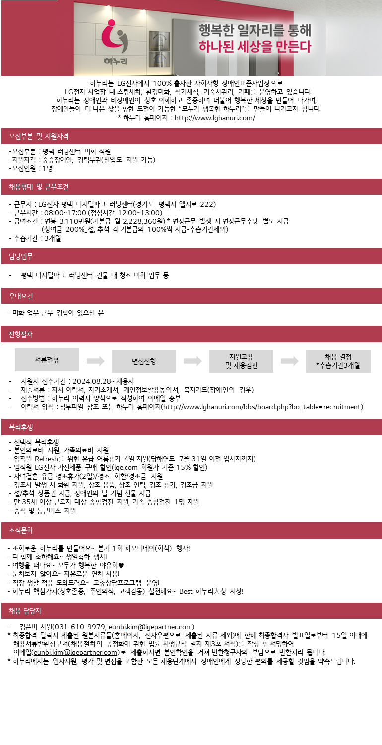 하누리 (LG전자 자회사) 평택지역 미화/청소 직원 채용