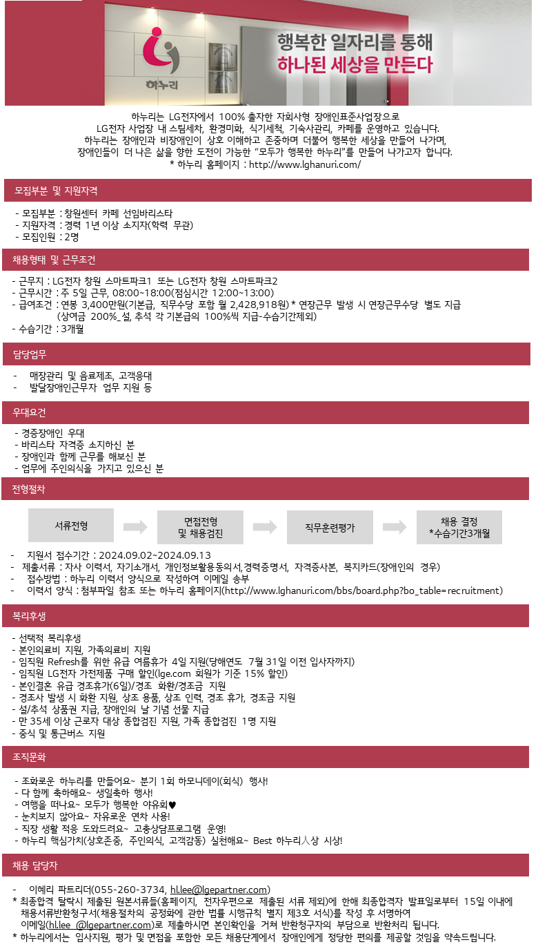 창원센터 바리스타 직원 채용(경증장애인 우대)