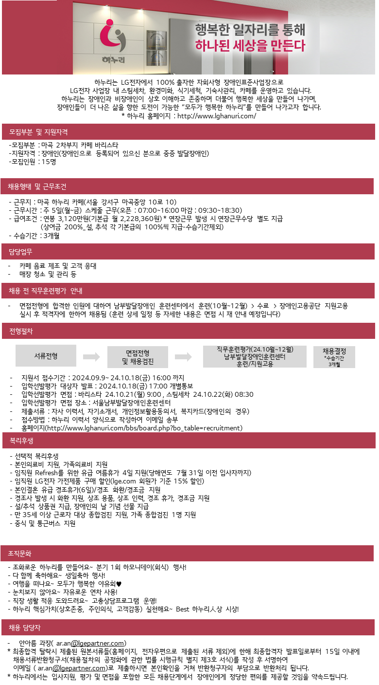[마감]서울서부센터 마곡지역 카페 바리스타 채용(중증 발달장애인)