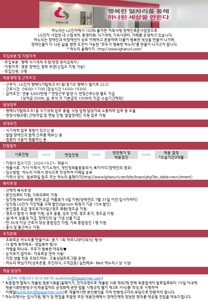 [마감]평택센터 식기세척 조장 채용(장애인)