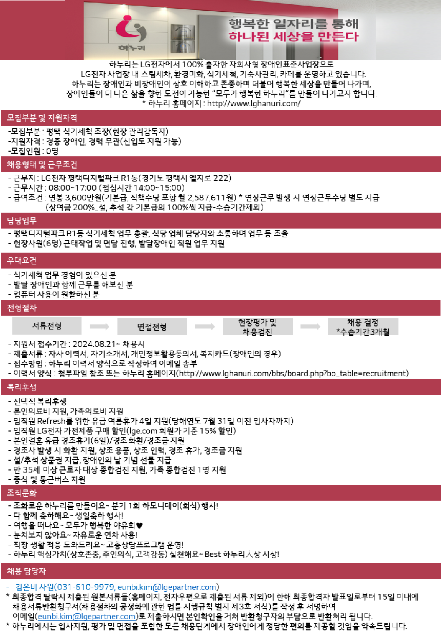 하누리(LG전자 자회사) 평택 식기세척조장 모집(장애인만 채용)