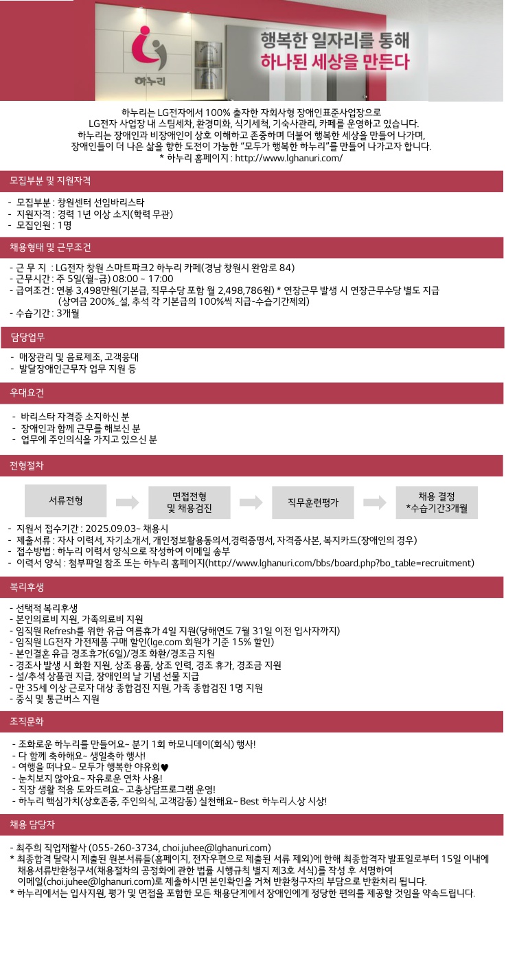 [마감]창원센터 카페 바리스타(선임급) 채용