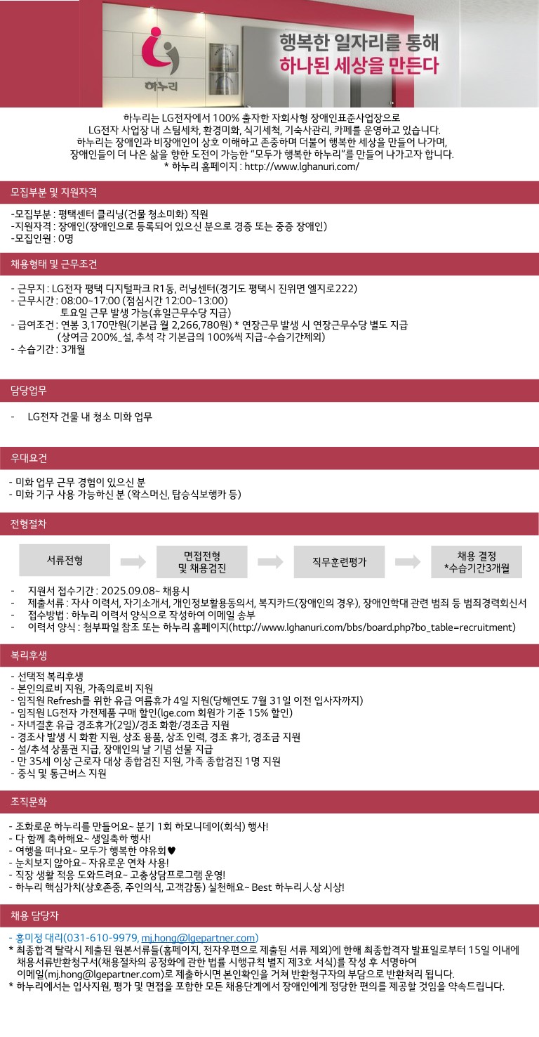 평택센터 미화 사원 채용(장애인)